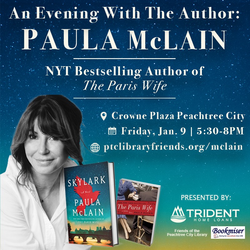 Join the Friends of the Peachtree City Library on Friday, January 9 for a cash-bar reception at 5:30 PM, followed by the Author Talk and Q&A at 7:00 PM. Guests who purchase a signed copy of Skylark will also receive a photo opportunity with Paula McLain.
