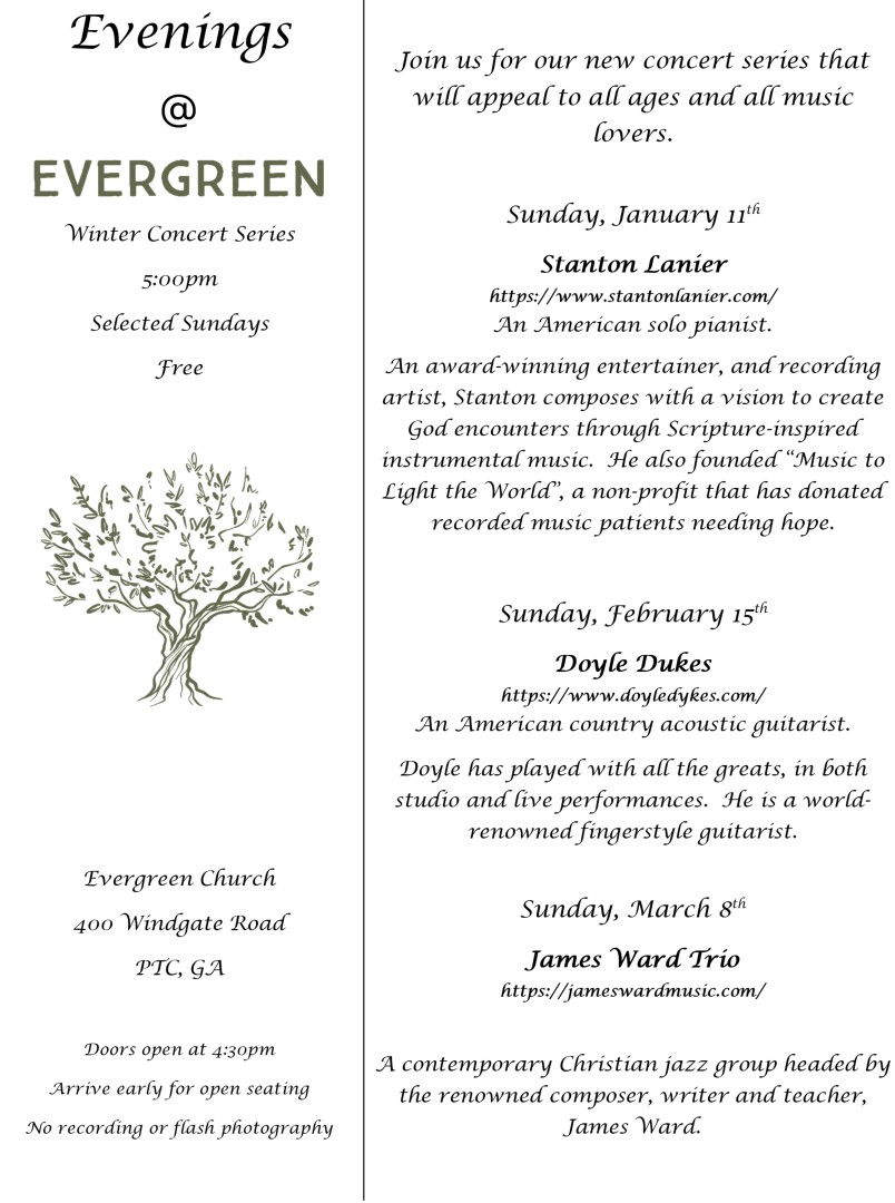 Join us at the third Evenings at Evergreen concert for a concert by the James Ward Trio. James Ward trio is a contemporary Christian jazz group headed by the renowned composer, writer and teacher, James Ward.